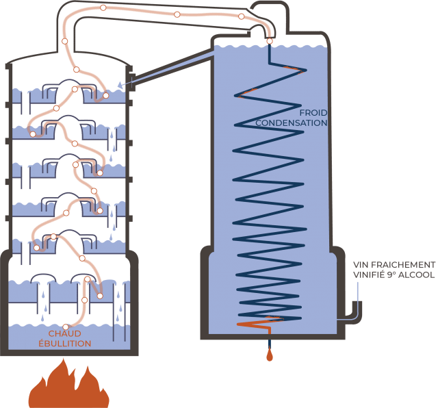 L’alambic « cognaçais » ou « charentais » est un alambic en cuivre dit à repasse (ou double chauffe) car l’alcool y est distillé deux fois. Une fois le vin porté à ébullition, les vapeurs s’échappent sans rencontrer le vin frais puis se condensent progressivement. Ce premier distillat, appelé “brouillis”, titre entre 27° et 32° d’alcool. Il est à nouveau chargé dans l’alambic pour une seconde distillation. Les fractions de début (“les têtes”) et de fin de distillation (“les queues”) sont écartées. Le “cœur” de la distillation, c’est-à-dire le distillat qui s’écoule entre les deux, sort de l’alambic à 72° d’alcool. Logé dans un fût en chêne, il s’enrichit des arômes du bois pour devenir le Cognac.