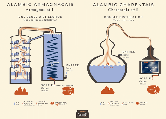 Les eaux-de-vie d’Armagnac et de Cognac naissent de deux alambics bien distincts. C’est d’ailleurs leur différence fondamentale. Le processus de distillation propre à chacun détermine la spécificité de ces eaux-de-vie. L’Armagnac n’est distillé qu’une seule fois, dans un alambic armagnacais (à colonnes), alors que le Cognac est distillé deux fois, dans un alambic charentais (à repasse).