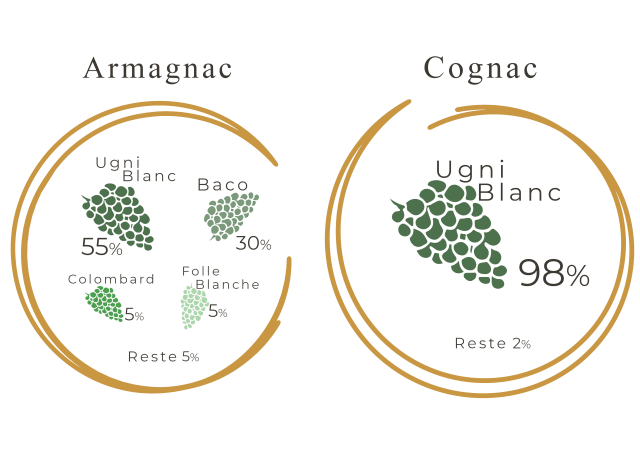 La diversité des cépages de l’Armagnac est due à la tradition viticole de la région qui produit avant tout un vin destiné à la dégustation. La région de Cognac produit essentiellement du vin destiné à la distillation.