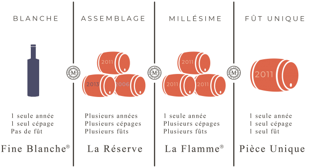 - Année 10 : après dégustation, les barriques les plus remarquables sont sélectionnées pour devenir des “Pièces Uniques”. Les autres sont assemblées pour former notre millésime “La Flamme®”.