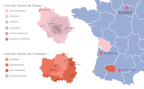 Les terroirs se distinguent par leurs sols et leur climat, signant la typicité de leurs eaux de vie. Le sol cognaçais est principalement calcaire, alors que le sol armagnacais est sablonneux, argilo-silicieux et argilo-calcaire. La région Armagnac connaît un climat continental alors que la région Cognac connaît un climat plus océanique.