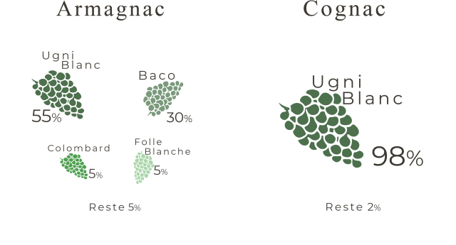 La diversité des cépages de l’Armagnac est due à la tradition viticole de la région qui produit avant tout un vin destiné à la dégustation. La région de Cognac produit essentiellement du vin destiné à la distillation.