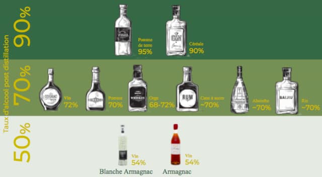 Alors que l’Armagnac sort de l’alambic à 56° d’alcool, le Cognac sort à 72° d’alcool. Tous deux se consomment cependant à 45° d’alcool. L’évaporation naturelle de l’alcool pendant le vieillissement permet à l’Armagnac de tendre doucement vers ses 40-45° à la vente, avec un léger ajout d’eau distillée lorsque cela est nécessaire. Certains Armagnacs, dits “bruts de fût”, sont élaborés sans adjonction d’eau. Le Cognac est quant à lui progressivement dilué avec de l’eau distillée ou déminéralisée pour atteindre ses 40-45° à la vente.